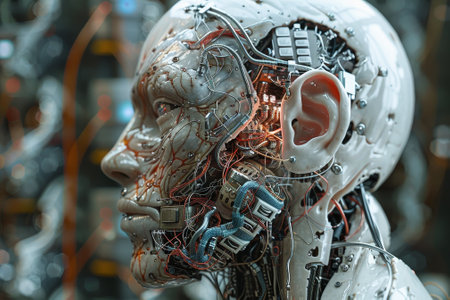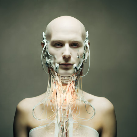 This image depicts a bald humanoid figure with exposed mechanical and electronic components integrated into their head and neck. The aesthetic combines human features with advanced technological elements, showcasing a fusion of biology and machinery. The background is minimalistic and neutral, focusing attention on the intricate details of the subjects cybernetic enhancements.