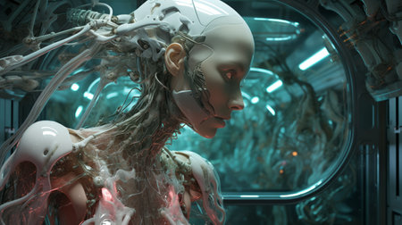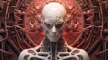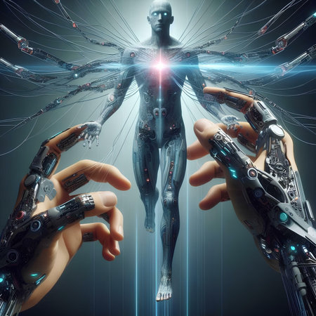 Symbiosis between human body and artificial intelligence and use of cells and partially mechanical limbs, skin, metal, visible energy flows, perfect human face. Generative AI
