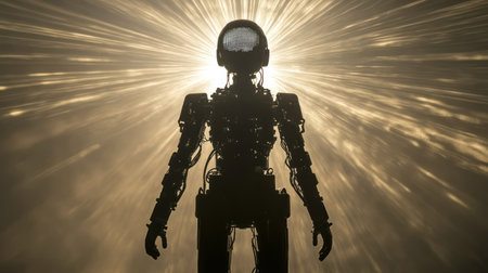 A silhouette of humanoid robot with illuminated head standing against radiant light beams, creating futuristic and mysterious atmosphere