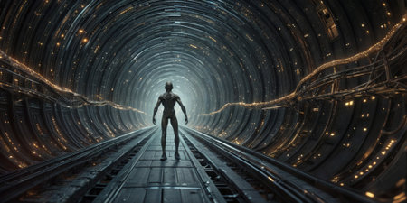 figure in black stands in the center of a train track within a tunnel. The tunnel is made of concentric circles of steel, and the ceiling and walls are made of stars