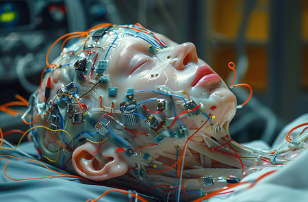 Conceptual image of a child with a cybernetic brain, depicting futuristic biotechnology and artificial intelligence with intricate wiring and electronic components.
