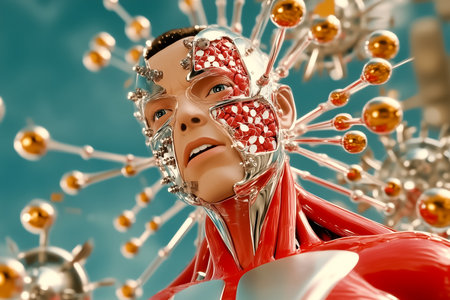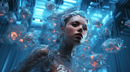 Robot human hybrid displays intricate internal structure surrounded by abstract spheres and particles. Futuristic setting with vibrant colors. Concept of technology, innovation, medical research.