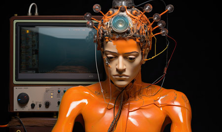 Futuristic humanoid figure with intricate wire design, portrayed against a vibrant orange background, embodying technology and artificial intelligence concepts
