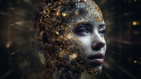 An AI generated illustration of A close-up portrait of a female's face with golden wires wrapping around her head