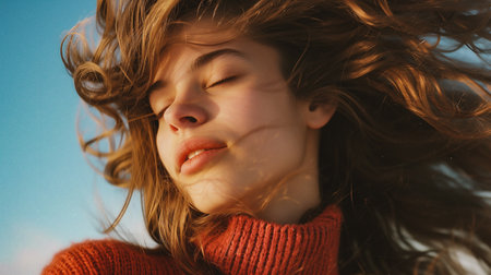 A woman with curly hair is enjoying the sunset on a beach, with her eyes closed and face tilted towards the sky.