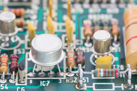 old tube chips with vintage transistors and resistors. small focusing area, selective focus. top view