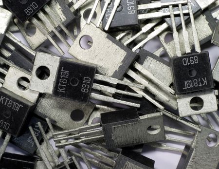 Old transistors on a white background. Electronic elements.