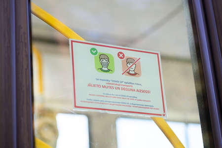 Dnepr, Ukraine- September 12, 2020: Caution and forbidden signs icon on glass in public transport, rules for being in public city transport