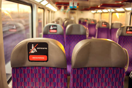 Social distance sign in train during the coronavirus pandemic. Empty seats in public transport with new social distancing protect rules during pandemic of coronavirus
