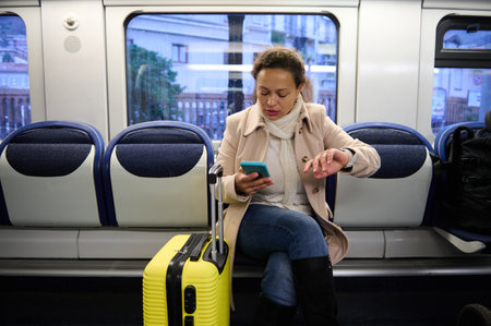 Woman seated on a train with a yellow suitcase, using her smartphone and checking the time. Traveling, public transport, commuting.