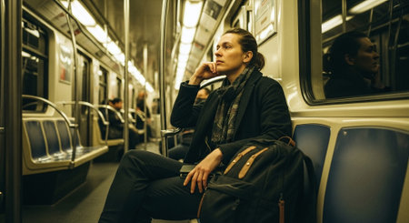 young woman stands in crowded subway train, her serious expression reflecting the busy, focused, anxious energy of commuters during morning rush hour in bustling city. High quality photo