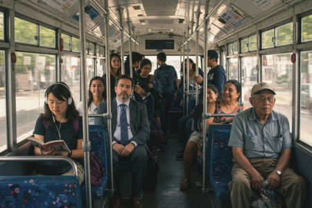 Passengers occupy a city bus during the day, engaging in various activities. Some read, while others focus on their surroundings, showcasing daily urban life and community. AI Generated