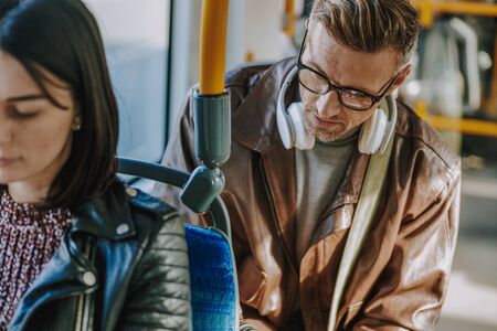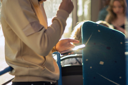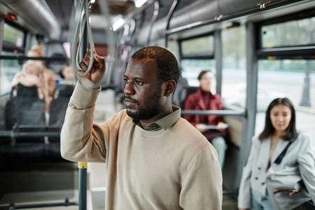 Waist up portrait of African-American man holding onto handle in bus while traveling by public transport in city, copy space