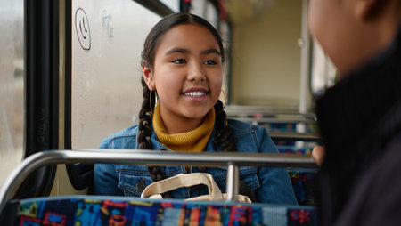 Passengers sit together sharing a moment of connection on a vibrant city bus while enjoying the ride.