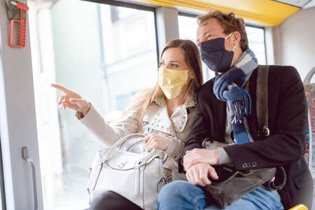 Young multiracial couple of friends chatting on a bus together. Two best friends are talking while sitting in a bus full of people. People in a public transport concept. Diverse romantic couple.