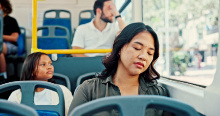Bus, sleeping and woman with nap, travel and burnout with public transportation. People, commute and girl with fatigue, tired and exhausted with rest, dream and window with urban journey or New York