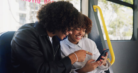 Love, phone and travel with couple on bus together for public transportation to destination. App, commute or social media with man and woman in vehicle for adventure, journey or trip to location