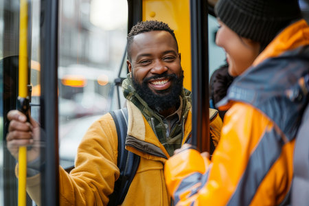 Smiling bus driver greets passengers as they board, emphasizing human element and service in public transportation.