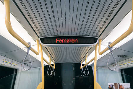 Interior view of a Copenhagen driverless metro train with passengers. Theme city passenger transport in Copenhagen. Subway in Denmark Copenhagen, February 18, 2019. People in the modern European metro