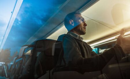 Caucasian Men and His Business Travel in Coach Bus. Public Transportation Theme. Passenger Behind Bus Window Talking to Someone.