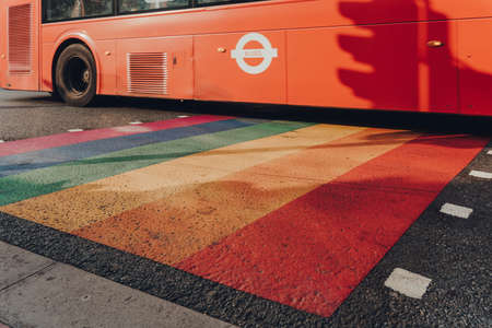 London, UK - August 12, 2020: Rainbow pedestrian crossing on High Street in Camden Town, London, a part of Pride month and in solidarity with Camden’s LGBT+ communities, bus riding over, motion blur.