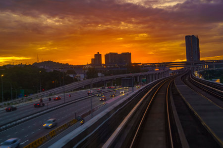 A stunning aerial view of the North-South Expressway near Kuala Lumpur, Malaysia at sunset. The city skyline and the elevated railway tracks create a picturesque scene.