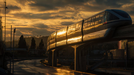 A stunning wide angle view of a Jakarta MRT train against a vibrant sunset, showcasing the dynamic urban landscape and modern infrastructure of the city.