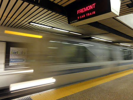 OAKLAND, CA - APRIL 20: BART Train speeds into Lake Merritt station platform. April 20, 2011 Oakland California