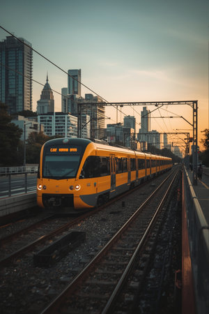 A captivating scene showcasing a vivid train track with bright yellow trains in a modern urban setting. The perspective emphasizes movement and technology.