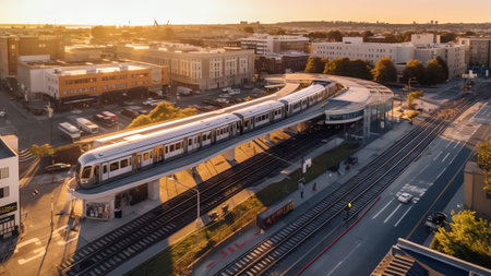 An AI generated illustration of an aerial view of a train moving through an urban landscape