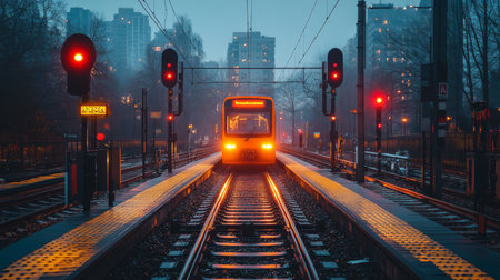 Train Approaches Station During Twilight With Automated Signaling and Operational Monitoring in a City Infrastructure Environment Generative AI