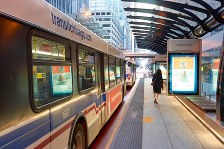 A well-organized public transport station with buses lined up and clear signage, emphasizing the efficiency of urban transit systems