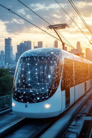 Modern, High-Speed Tram in Urban Environment, Public Transportation, Sustainable City Infrastructure