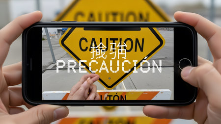Smartphone screen displays a caution sign translated into multiple languages with AR overlay.