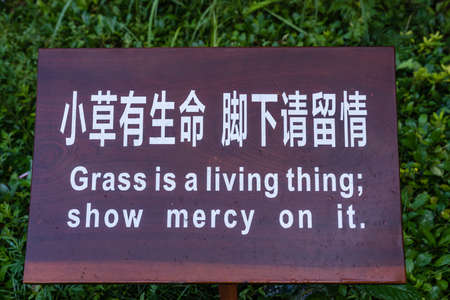 Chongqing, China - August 2019 : Sign in front of a lawn stating that grass is a living thing, show mercy on it, written in English and chinese