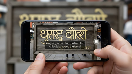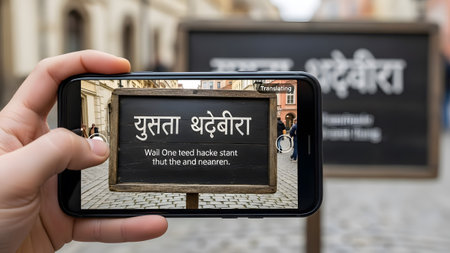 Smartphone translating a wooden sign with Devanagari and English text using AR. Clear details and...