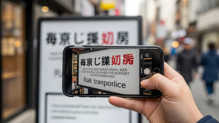 Smartphone photographing and translating Japanese text on a street sign in a city Clear details a...
