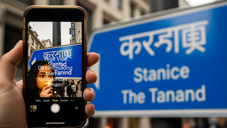 Smartphone screen shows AR translation of a blue street sign with foreign language text Clear det...