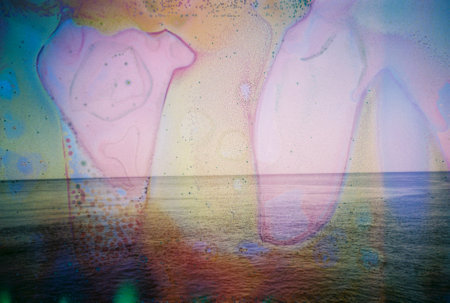 Vintage distressed blurry and grained photo. Damaged camera film. Mystical, psychedelic, nostalgic picture. Sea view.
