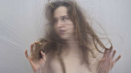 surreal, strange portrait with protective defensive hands in anxiety dream in lockdown of beautiful sexy sensual seductive woman behind transparent plastic foil, copy space