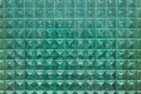 Decorative corrugated translucent glass with green color. Abstract background, texture, pattern. Copy space and frame