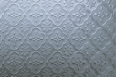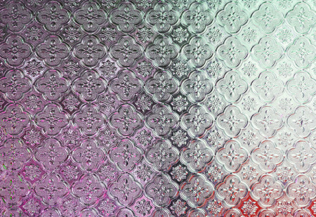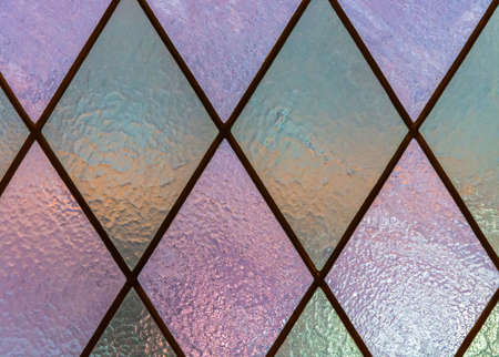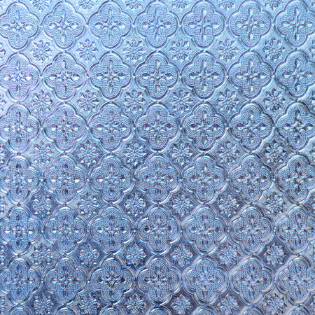 Close up pattern surface and texture of blue tinted glass window background. Close-up detail of classic pattern of stained glass.