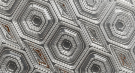 An extreme macro shot of a textured, transparent surface, like glass or plastic. The pattern consists of raised, interlocking geometric shapes, primarily hexagons and diamonds, with some small specks of rust.