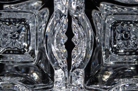 Detail of glass liquor bottle cut square hexagons illuminated in dark horizontal