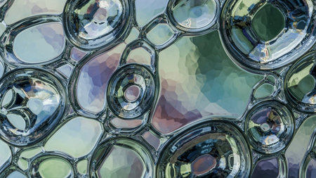 Macro view of iridescent bubbles forming an interconnected network with reflective surfaces and soft pastel colors.