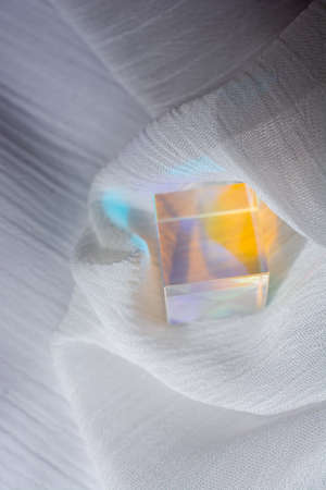 Glass cube with color spectrum rays on fabric. Abstract background with reflection and refraction of light.