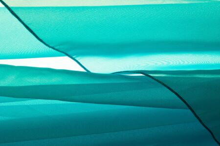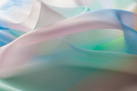 Texture, background, pattern. Silk fabric is transparent, yellow-pink green in blue. Abstract soft chiffon texture background.