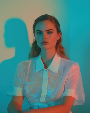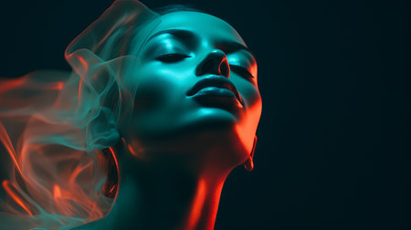 Cinematic headshot of a model illuminated by teal and orange gels. AI-generated.