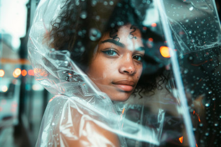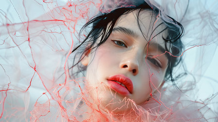 a woman with dark hair and closed eyes raised her head up and a transparent cloth