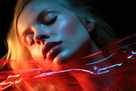 Beauty portrait. Lip augmentation. Plastic surgery. Anti aging procedure. Cropped closeup of sensual woman face in red neon light transparent wrinkled polyethylene film drop.